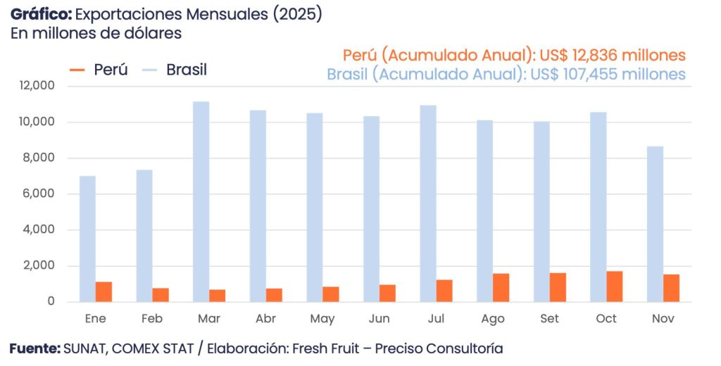 Según Fresh Fruit, entre enero y noviembre del 2025, Brasil exportó US$ 107 mil millones en productos agro y agroindustriales. La canasta revela una economía diseñada para la escala: soya, café, azúcar y maíz explican la mayor parte del valor; mientras que el Perú, con menor volumen, suele concentrarse en diversificación (fruta y agroindustria).