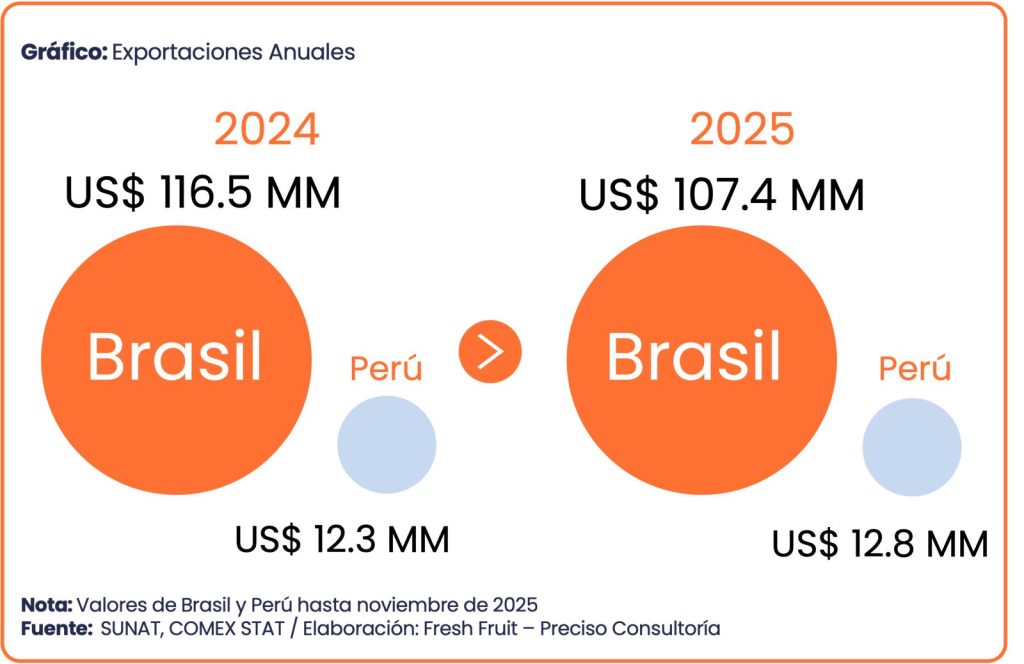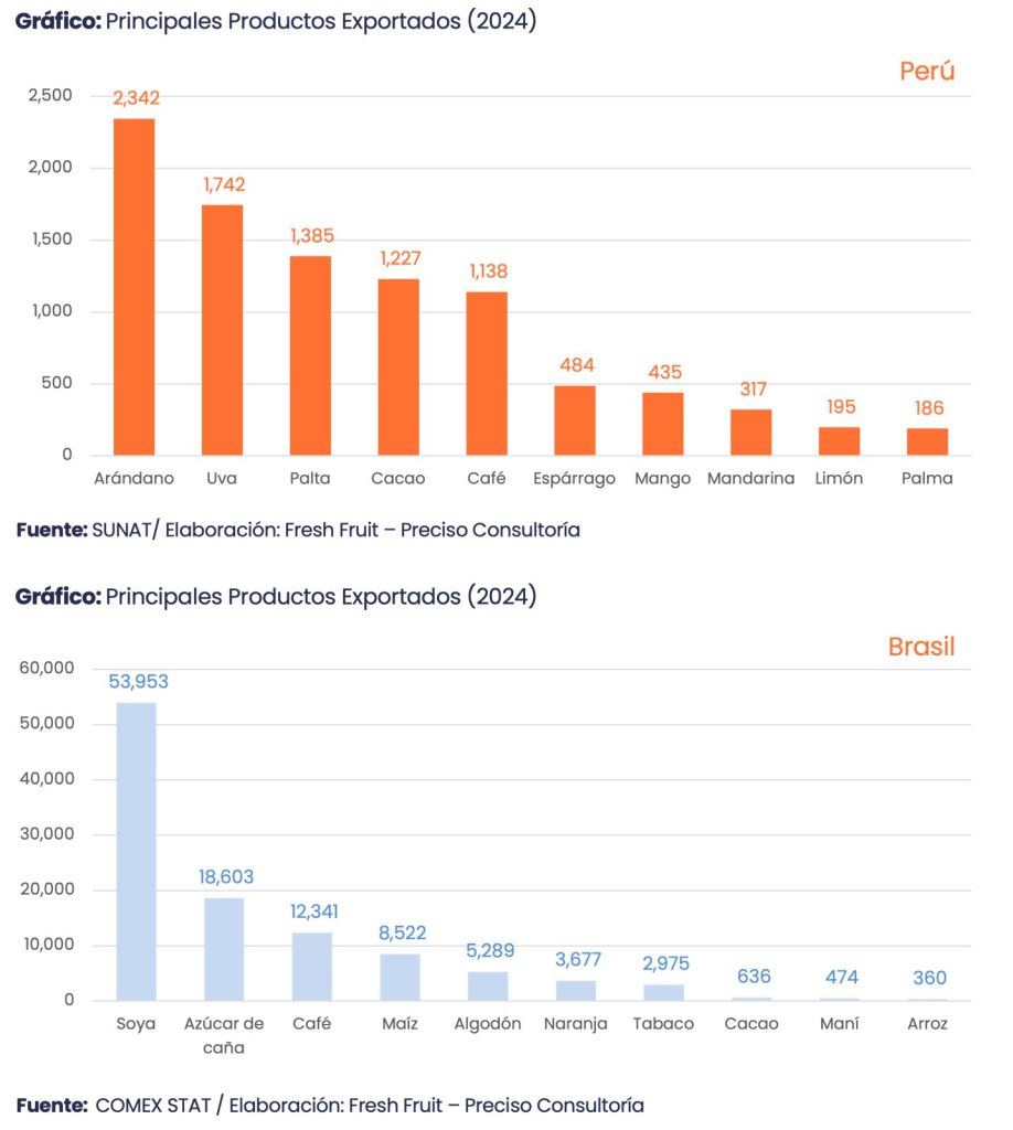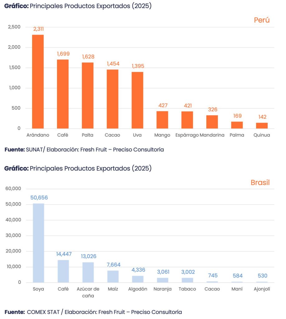 La comparación con el Perú sirve para entender dos modelos. Brasil, por tamaño y estructura productiva, tiende a concentrar su potencia exportadora en commodities de alta rotación (soya, maíz, azúcar, café). El Perú, en cambio, suele construir su presencia internacional desde fruta fresca y agroindustria de nicho, donde cuentan más la ventana comercial, la logística de frío, la certificación y la diferenciación por calidad.